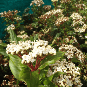 Viburnum tinus -Groenblijvende sneeuwbal-, ach wie kent hem niet? Veel toegepast in gewenste maten, vormen en diverse standplaatsen. Dat wil wel wat zeggen als je dat als plant allemaal tolereert. De Viburnum tinus is sterk en voor alle standplaatsen, ook in de Schaduw. Alleen volle zon in droge zandgrond wordt minder gewaardeert. Bloeit op een uitzonderlijk tijdstip van november tot februari-maart met crèmewitte schermen. Deze veranderen later in steenblauwe bessen. Het blad maakt de Groenblijvende sneeuwbal geschikt als haag of welke knipvorm dan ook. Hoe meer snoei, hoe mooier de vorm zal zijn.